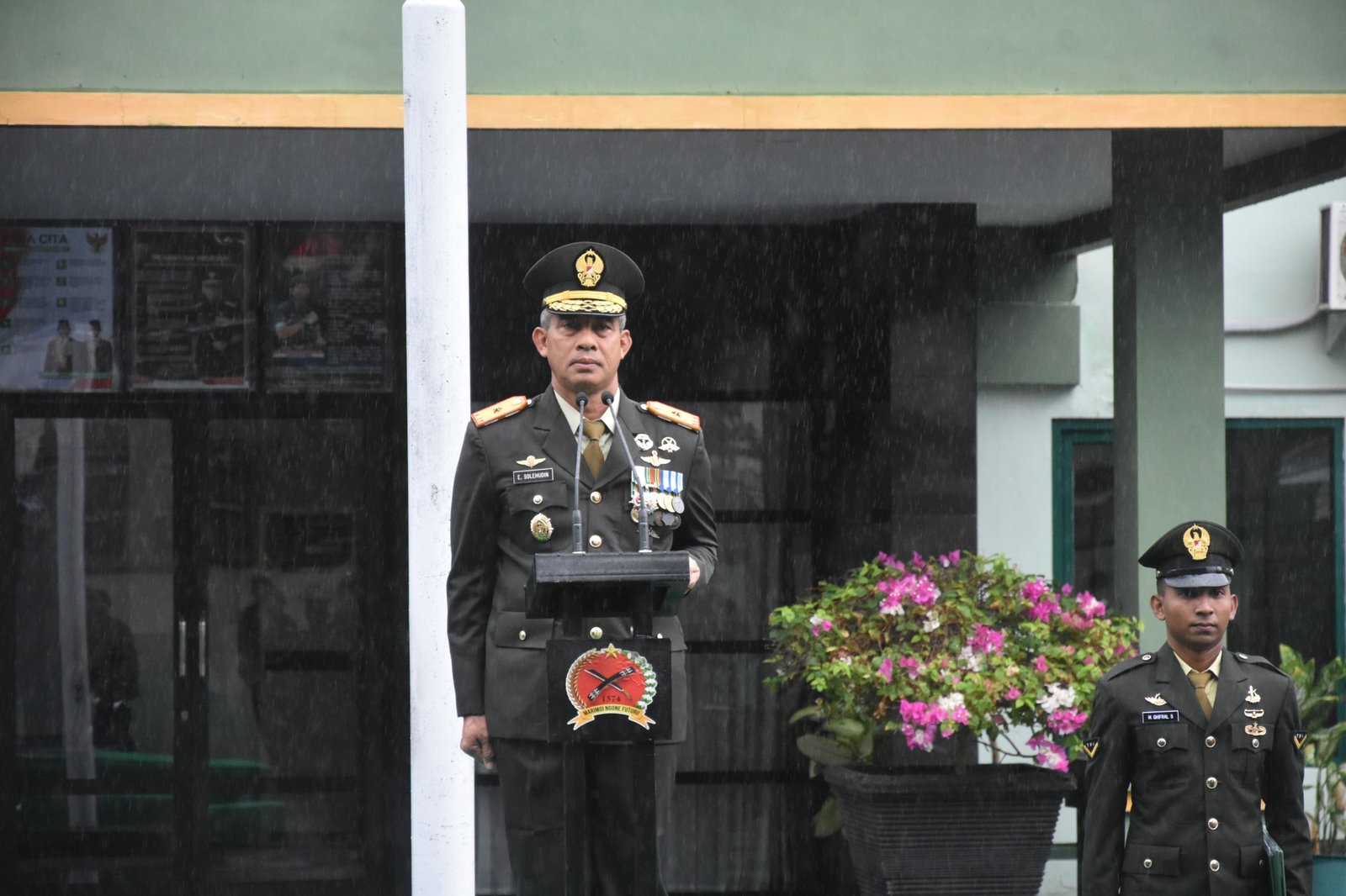 TERNATE, MALUTTODAY – Upacara peringatan hari pahlawan di Markas Korem 152/Baabullah pada Senin (10/11/2025), berlangsung dalam guyuran hujan. Meskipun hujan terus mengguyur, namun upacara berjalan lancar dan khidmat.
