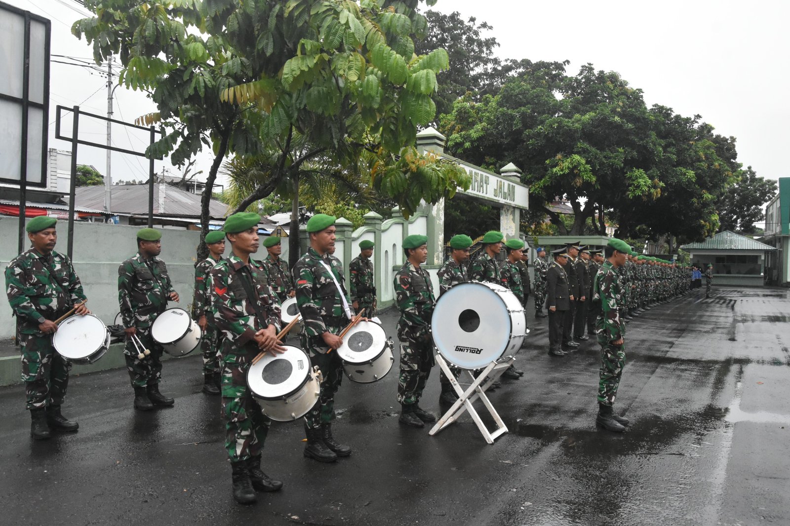 Meskipun dalam guyuran hujan, tak menggoyahkan semangat seluruh prajurit dan PNS jajaran Korem 152/Baabullah. (*)