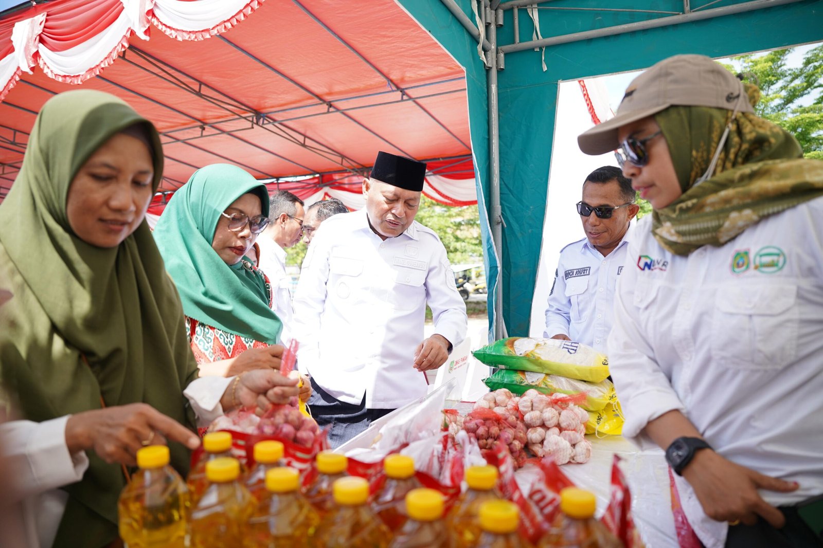 Sejumlah bahan pokok dijual dengan harga masing-masing beras SPHP Rp 60.000/5kg, minyak goreng Rp 17.000/ltr, gula pasir Rp 17.000/kg, cabai rawit Rp 40.000/kg, cabai keriting Rp 30.000/kg dan bawang putih Rp 20.000/0.5 kg (maksimal dua item per orang).