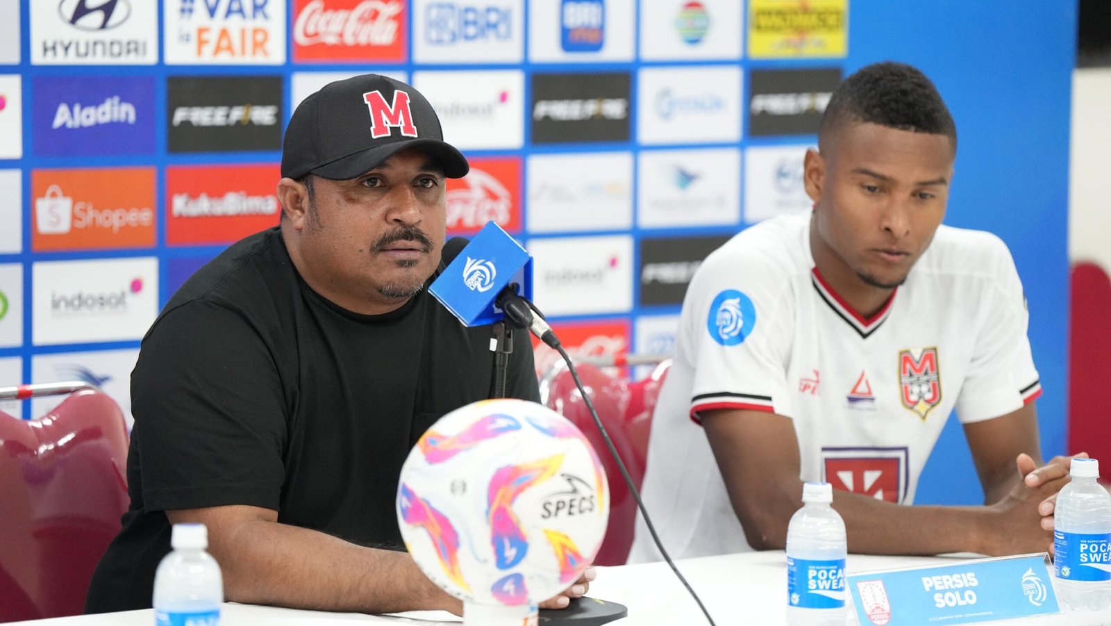 Pelatih kepala Malut United, Imran Nahumarury dan gelandang bertahan Malut United Wbeymar Angulo saat memberikan keterangan pers usai laga pada Sabtu (12/4/2025). (foto Malut United)